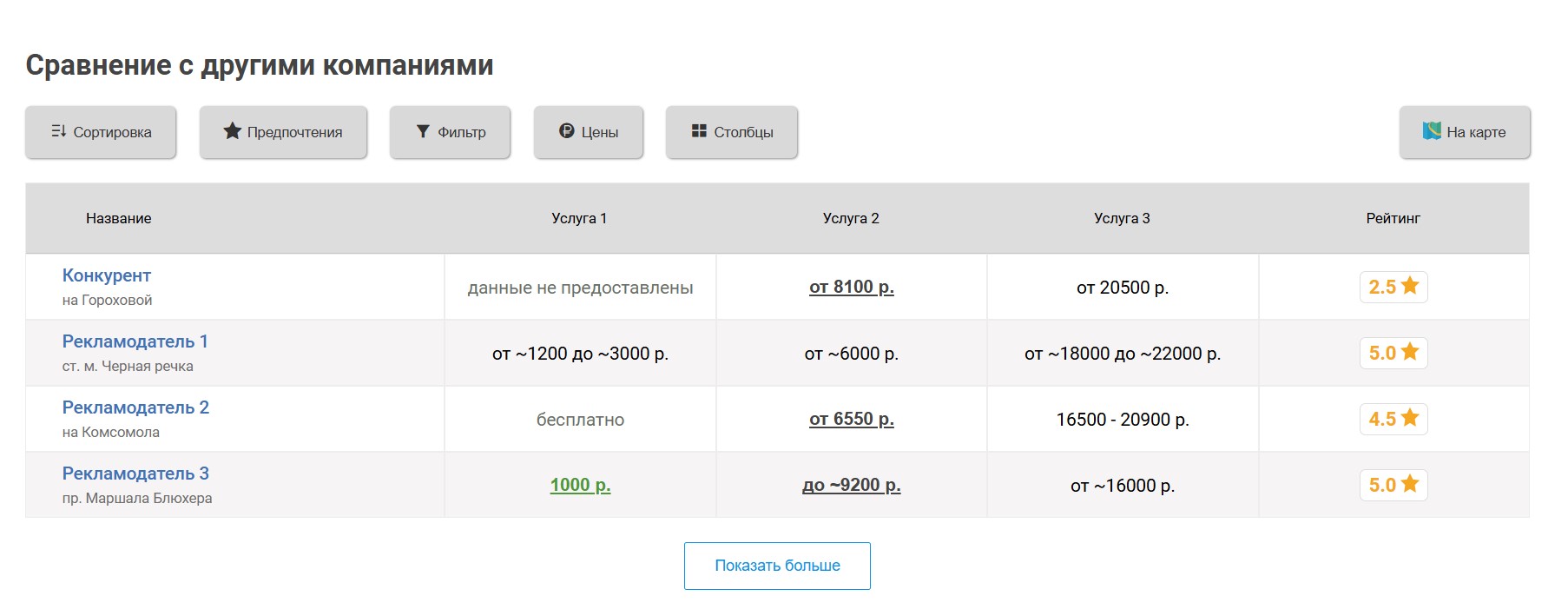 фотостудий, продвигаемая фотостудия попадёт к ним в таблицу «Сравнение по ценам», которая выглядит следующим образом:
